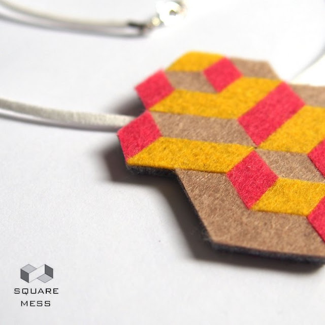 SquareMess to filcowa biżuteria o nietypowych geometrycznych kształtach i ciekawych kolorach. Każdy naszyjnik ma niepowtarzalny wzór wykonany ręcznie według własnego projektu.